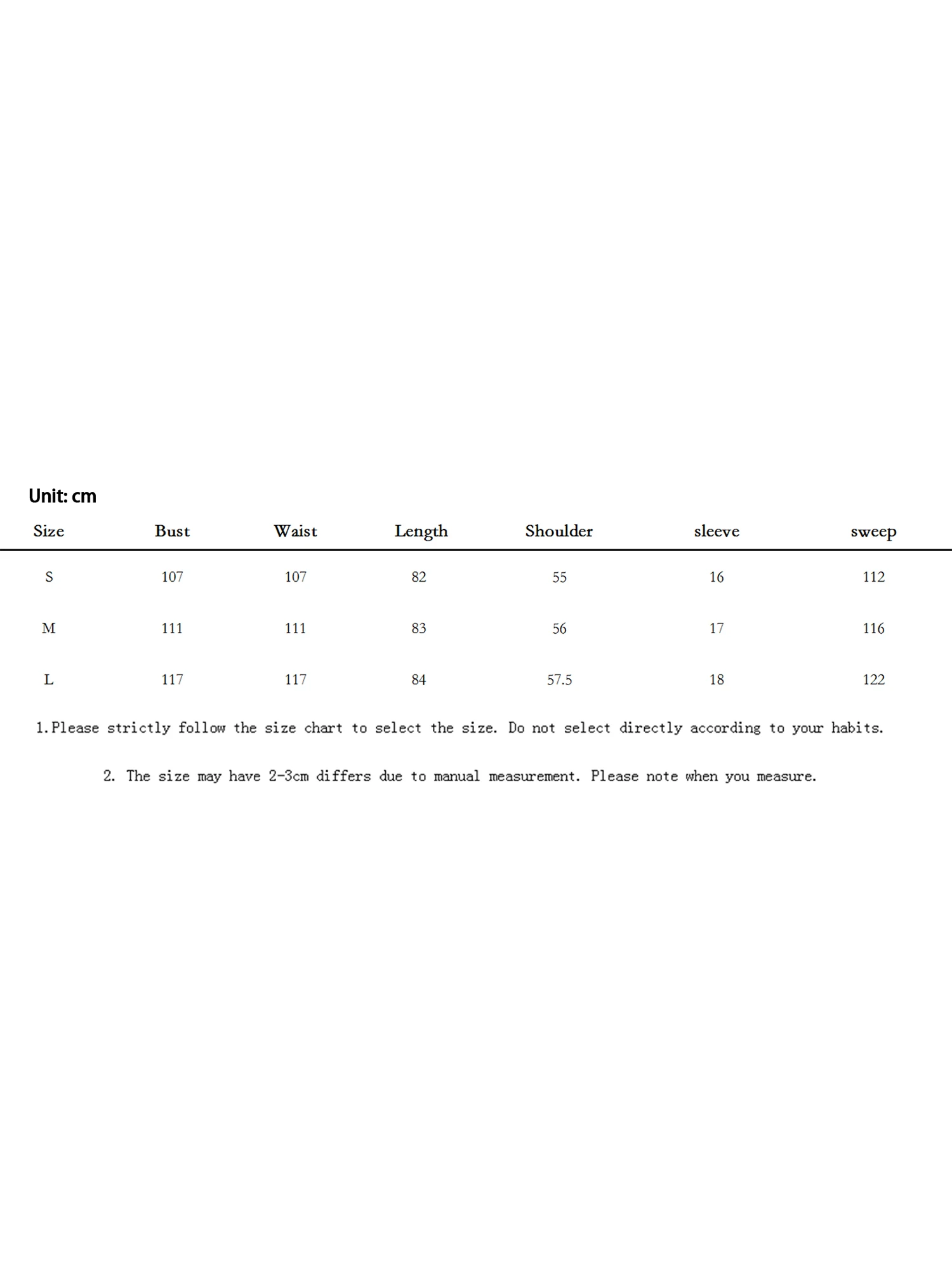 L Length: 84 Bust: 117 Waist: 117 Sweep: 122 Sleeve: 18 Shoulder: 57.5