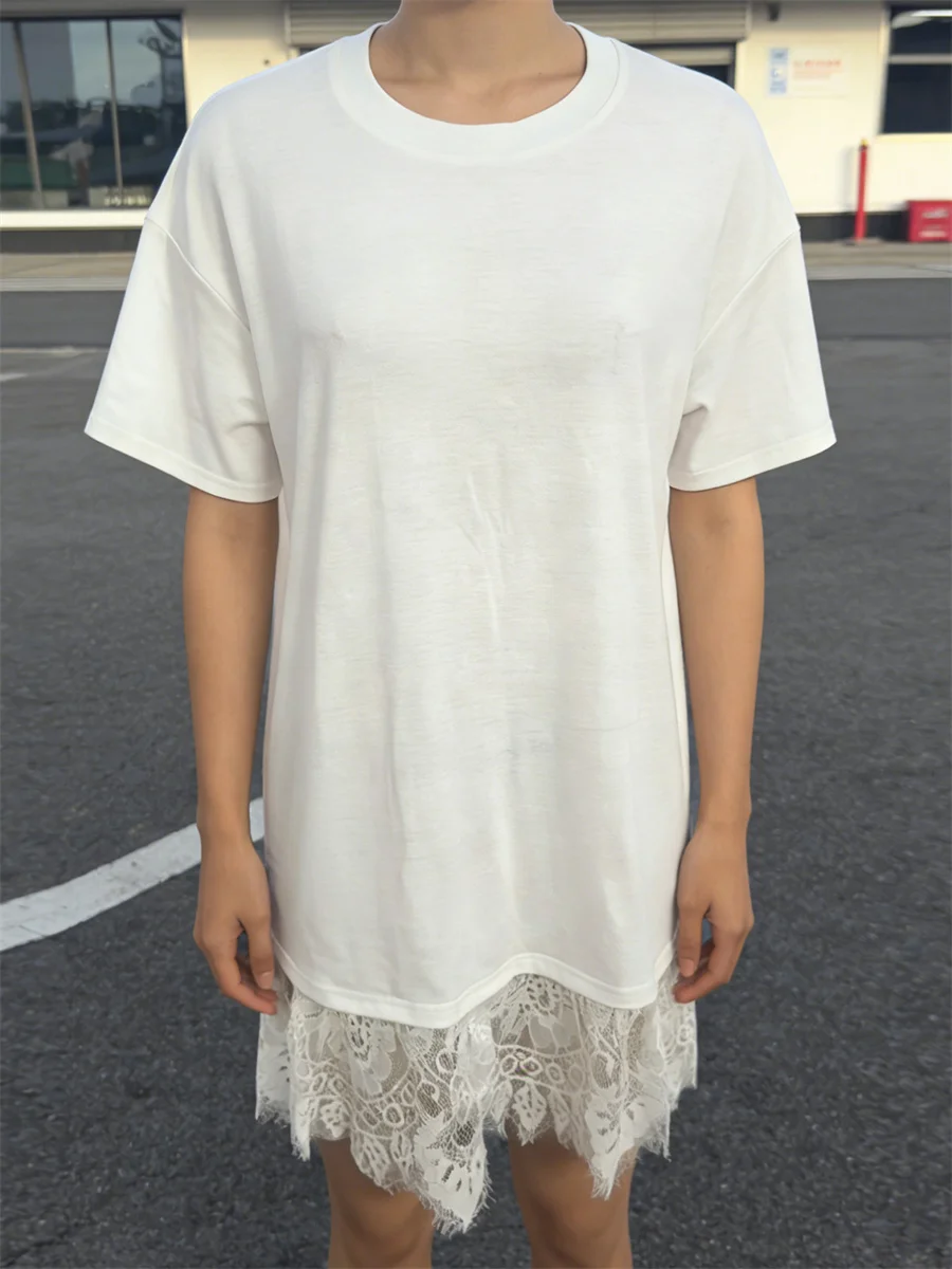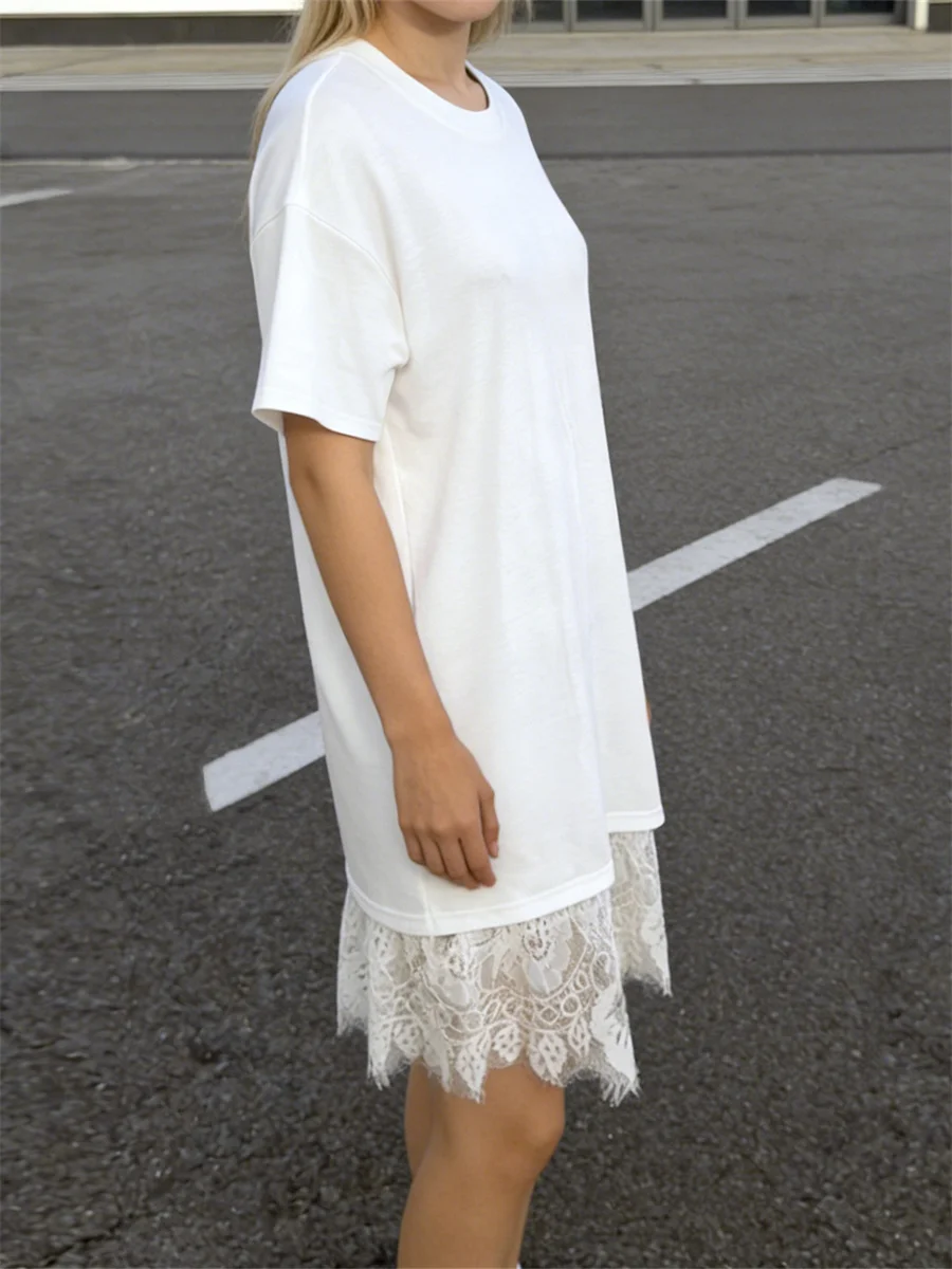 Women’s Summer Long T Shirt Elegant Lace Trim Short Sleeve Round Neck Loose Fit Tops for Casual Daily Wear