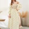 Womens Slim Long Dress Sheer Lace Flower See Through Long-Sleeve Off Shoulder Dress for Spring Summer