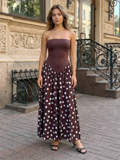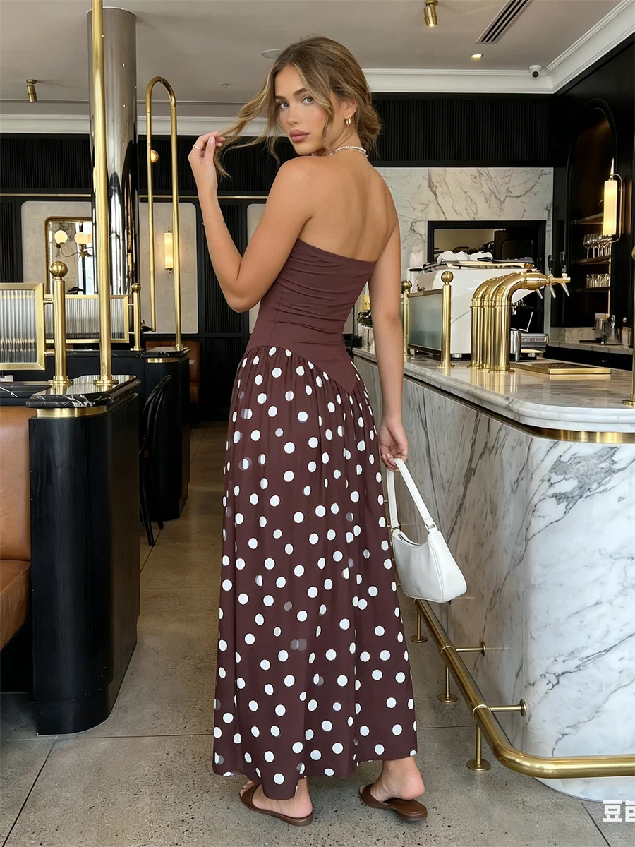 Women Long Tube Top Dress Dot Print Sleeveless Waist Cinching A Line Dress for Party Club
