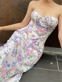 Women Sling Dress, Spaghetti Straps Low-cut Flower Print Summer Midi Dress for Party Vacation
